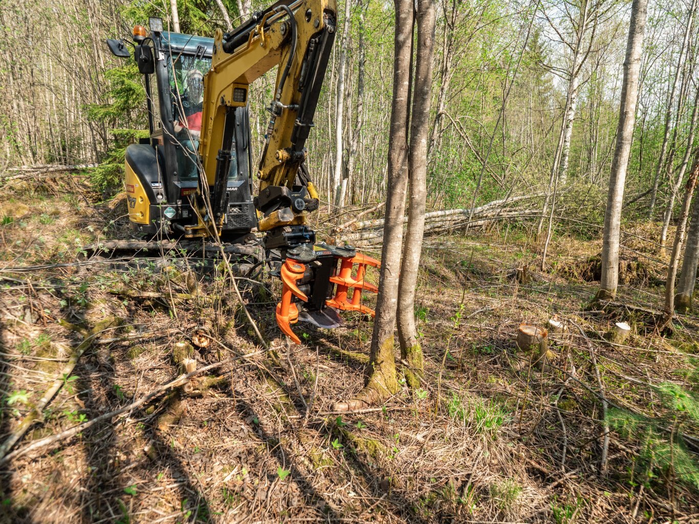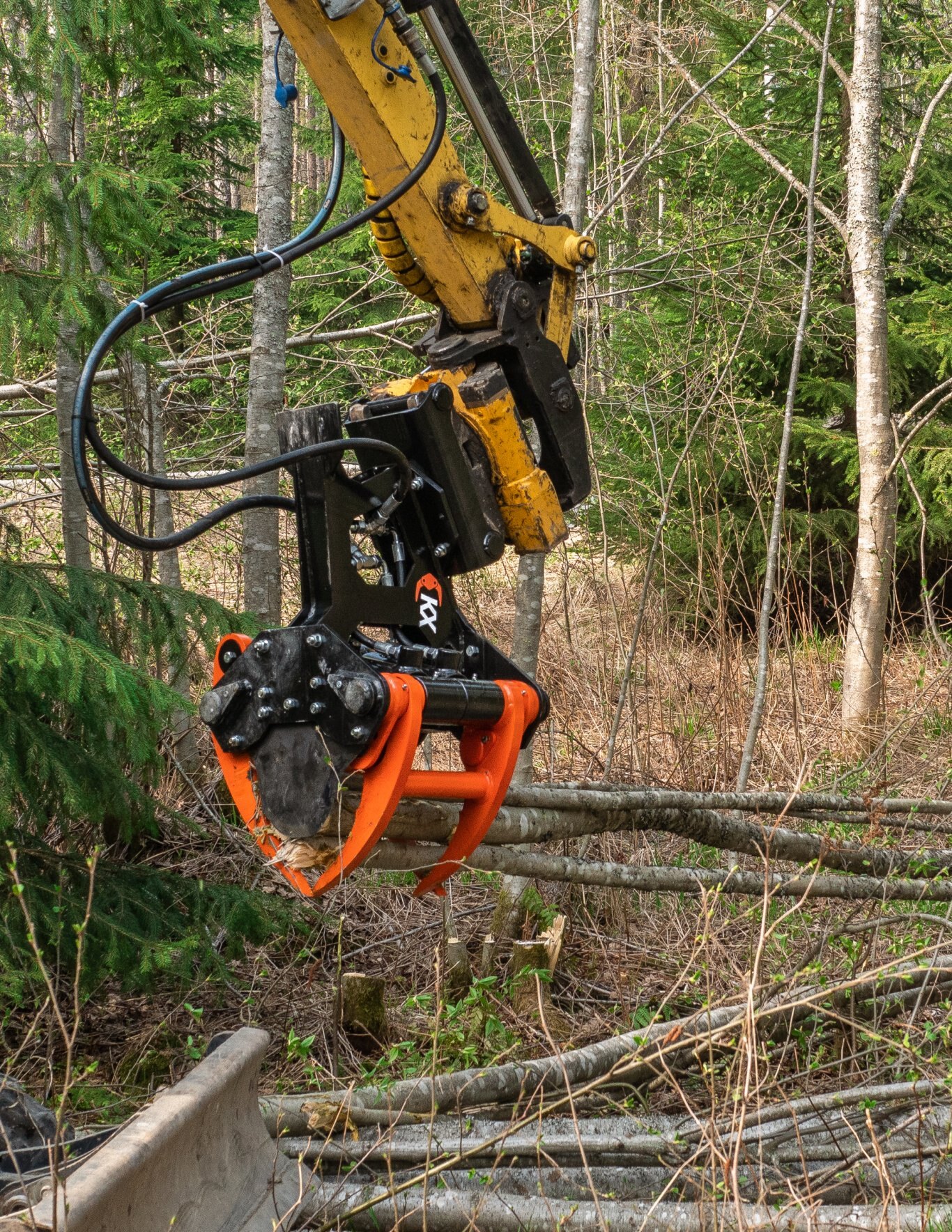 The KX Tree Shear is a new kind of energy wood grapple. The result of long experience and continuous development work is an easy-to-use, efficient and lightweight energy grapple that can be used for many different applications. Thanks to the modular structure and the easily removable blade, logging, clearing and installation work are effortless. The optional mass handling device enables several successive cuts and thus brings efficiency to timber harvesting.