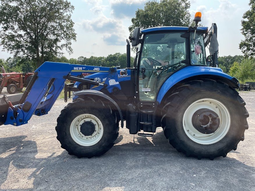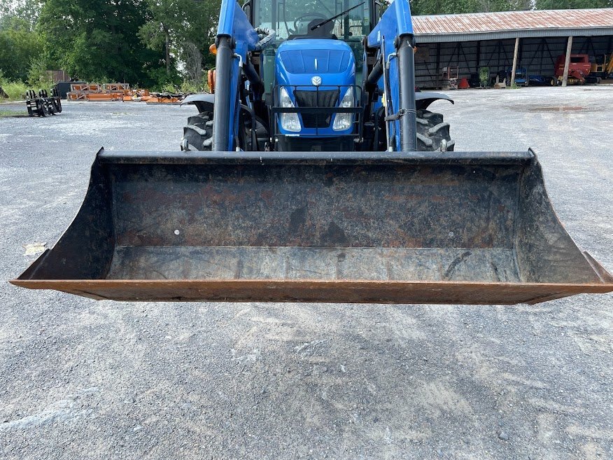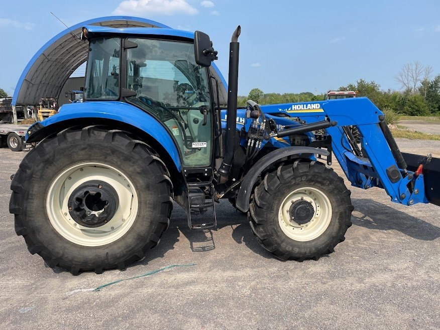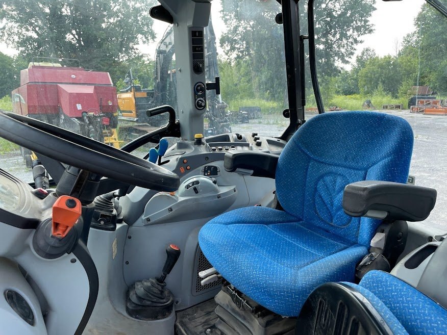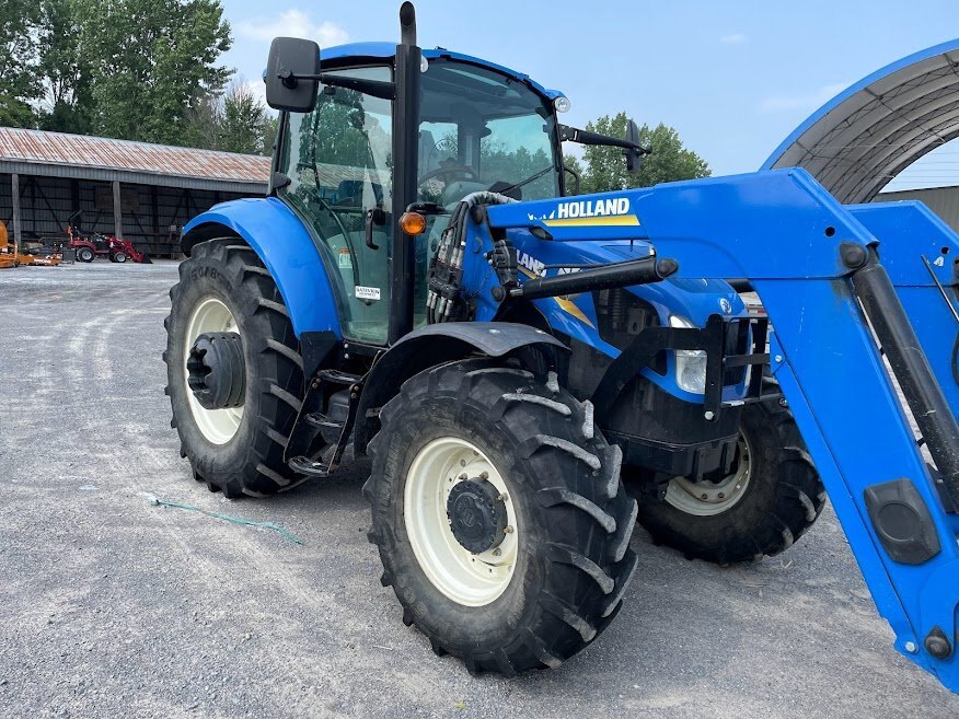 2014 New Holland T5.95, 98 engine horsepower, 82 pto horsepower, Four wheel drive, Deluxe cab with heater & air conditioning, High Visibility roof panel, Air suspension seat, Instructor seat, 24 forward x 24 reverse speed Dual Command transmission, Power Shuttle, (2) sets of rear remotes, 540/1000 pto, 21.1 gpm hydraulic pump, Front fenders, 18.4R34 radial rear tires, 14.9R24 radial front tires, New Holland 830TL loader with Euro quick-attach, 2971 Hours, Price Reduced from $88900 to $79900