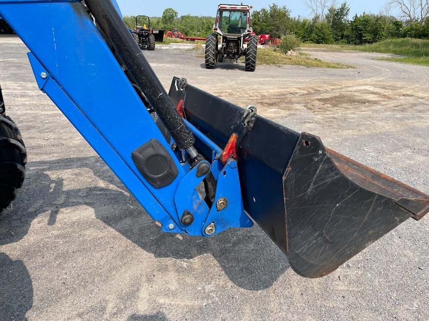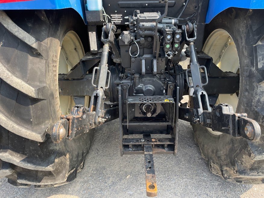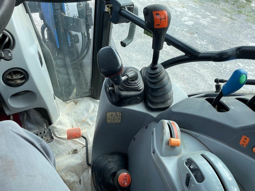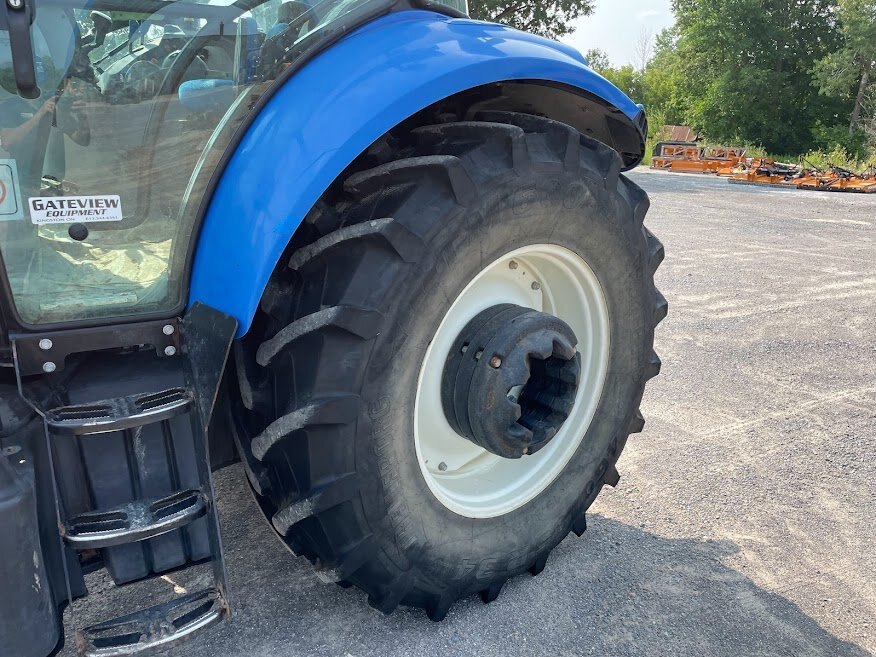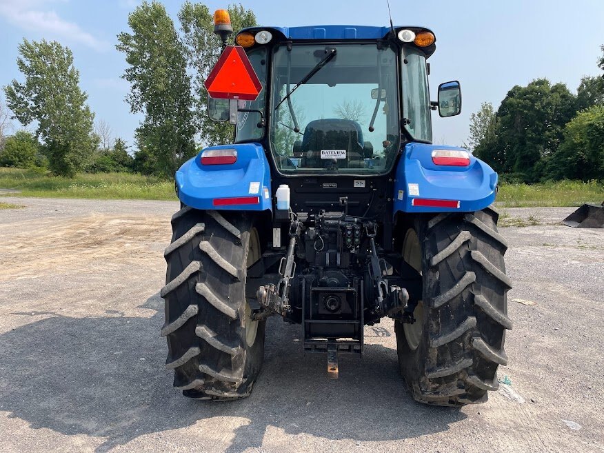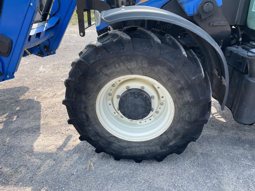 2014 New Holland T5.95, 98 engine horsepower, 82 pto horsepower, Four wheel drive, Deluxe cab with heater & air conditioning, High Visibility roof panel, Air suspension seat, Instructor seat, 24 forward x 24 reverse speed Dual Command transmission, Power Shuttle, (2) sets of rear remotes, 540/1000 pto, 21.1 gpm hydraulic pump, Front fenders, 18.4R34 radial rear tires, 14.9R24 radial front tires, New Holland 830TL loader with Euro quick-attach, 2971 Hours, Price Reduced from $88900 to $79900