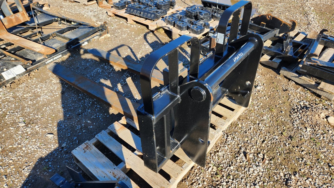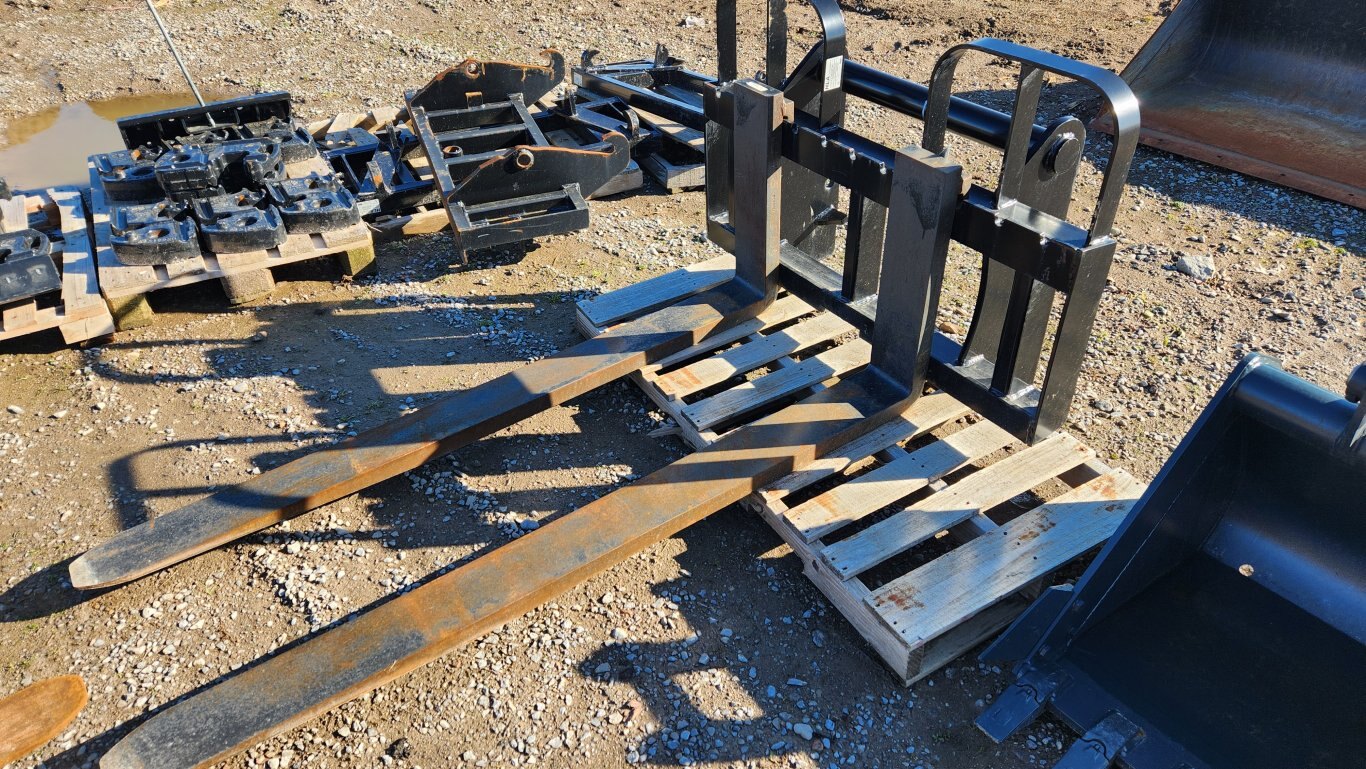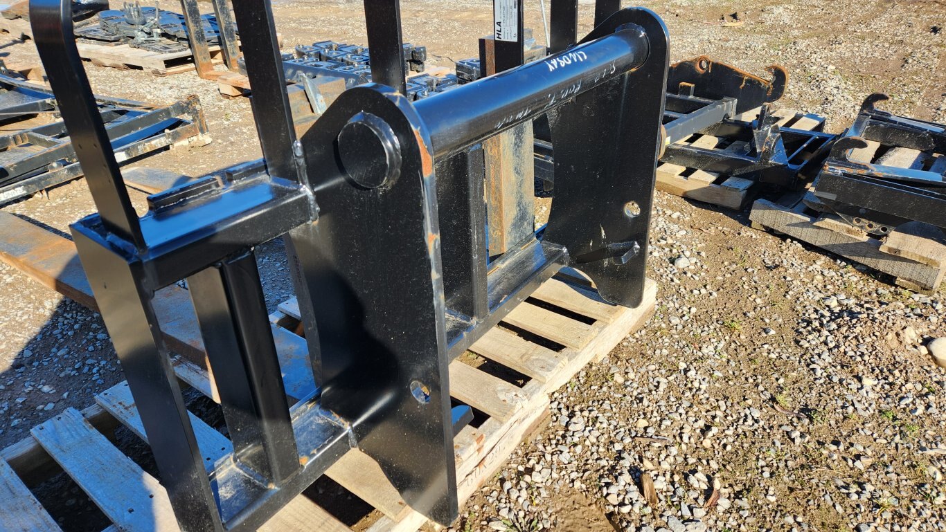 BRAND NEW HLA HD100MAQT pallet forks, Manitou quick-attach, 10000 lb. capacity, 72 inch tine length, 2 inch x 6 inch Class III solid tines, Guard, Sliding adjustable tines, 50 inch wide carriage