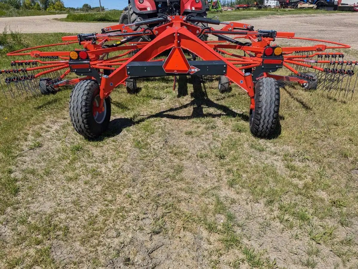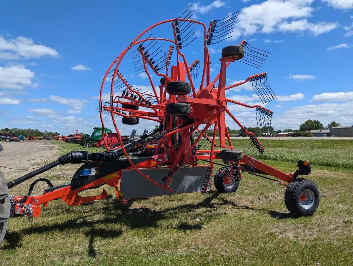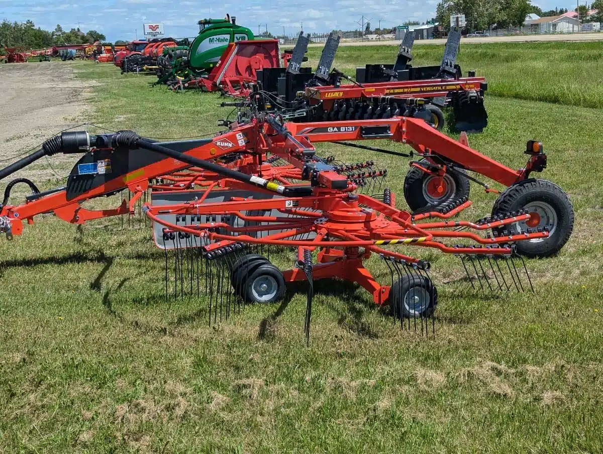 2024 Kuhn GA 8131 Twin-Rotor Rotary Rake. 540 PTO, Max working width 26'3". Lighting Kit, Rotor Flotation. Wheel Set 11.5/80-15.3. The GA 8131 central-delivery rake, with high production and excellent raking cleanliness, creates the ideal windrow for forage chopping and making round or large square bales.