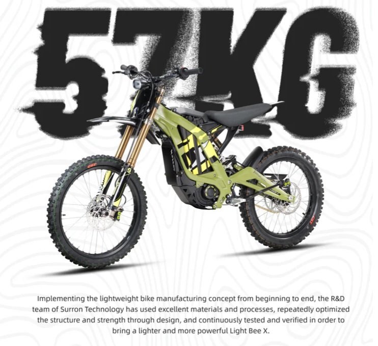 MSRP does not include inbound freight/pdi ($599) or taxesPart dirt bike. Part MTB. All electric.With 8 kW of electric power, a 75 km cruising range, a top speed of 75 km/h, and a curb weight of just 57 kg, the 2025 Surron Light Bee X sets a new standard in premium electric off-road technology. The 2025 Light Bee X has evolved into a worldwide icon, loved for its accessibility, edgy design, zero emissions, and noise-free operation. Its lightweight forged aluminum alloy frame is paired with an advanced off-road suspension system, making it perfect for this high-performance electric platform. Easy to handle and maneuver for beginners, the Light Bee X also excites seasoned off-road enthusiasts with its ability to tackle even the toughest trail obstacles. Delivering a climbing ability of over 45 degrees, up to 75 km of range with optimized efficiency, and a fast charging time of just 2 hours, the 2025 Light Bee X offers endless thrills on any terrain. Featuring a powerful 60V/40Ah lithium-ion battery, adjustable throttle curve, and a lightweight design, this model is ready for adventure. |
