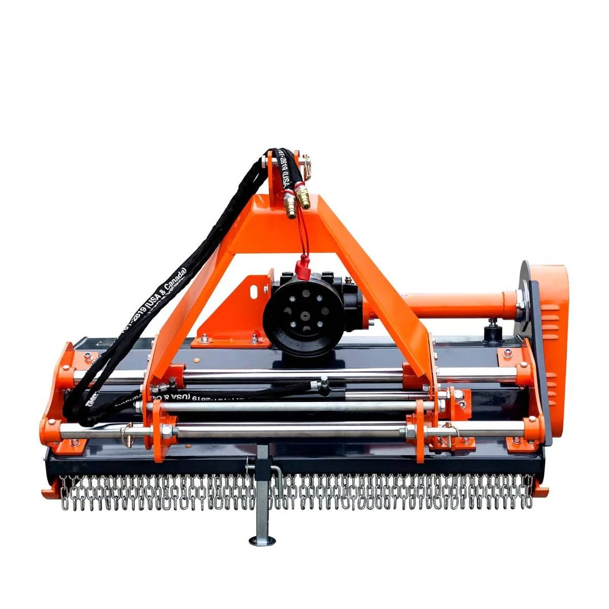The TMG-TFMS50 Side Shift Flail Mower makes the cutting of uneven, overgrown and sloped terrain efficient and easy to do. Tough, matted grass and weeds are no match for this mower's heavy duty 660 lb frame and forged flail hammers that chew up anything in their path. A hydraulically controlled side shifting offset can move approximately 14” to trim under low, overhanging tree branches or bushes and maintain hard to reach areas of all kinds. Compatible with 20-50 HP tractors and Category 1 three point hitch or Quick-Hitch systems for the ultimate attachment needed at your home, farm or commercial property. The 49” of working width makes the reclaiming or maintenance of a large yard enjoyable, dynamic and cost-effective. Forget the hassle of traditional rotary mowers that constantly jam and clog on unconventional ground. This flail mower chews up wild growth and turns it into a nicely sized mulch that gets distributed evenly out the back with no need for extra, unnecessary clean up. Treat yourself and visitors to an always fresh and presentable welcome with this mower's effortless maneuverability around difficult contours and angled lineaments. The three-point hitch system has been designed for front to back flotation that produces a consistent, clean cut that looks groomed and professional. Blade rotor shaft driven with three drive belts and protective guards give the owner of this mower a safe and powerful operating experience. This is an ideal product for the restoration and upkeep of roadways, building sites, pitched grounds, farm, ranch and residential lands. |