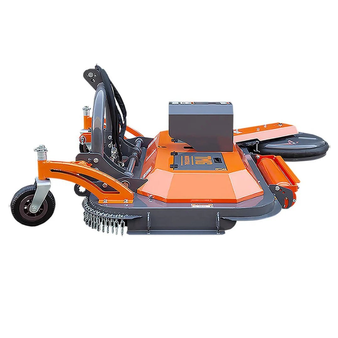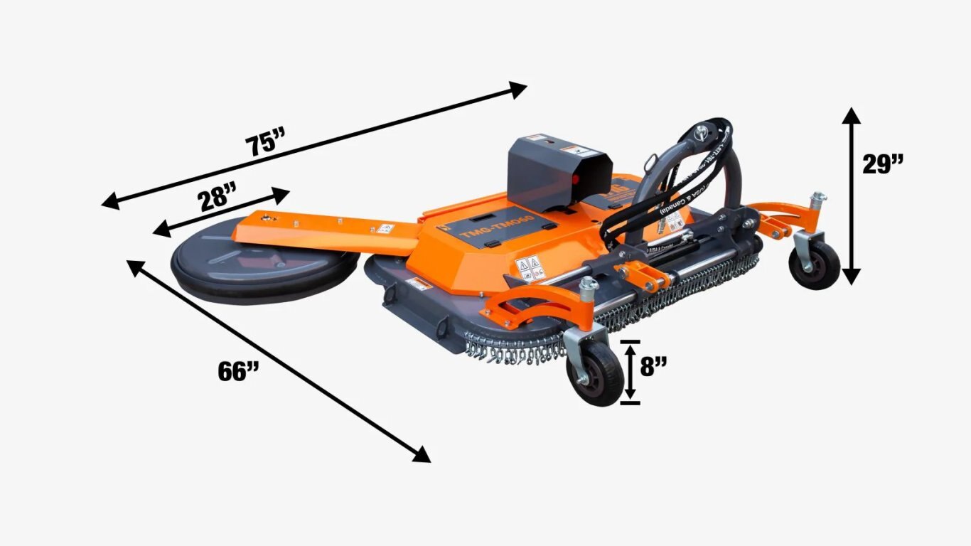 The TMG-TMO60 Offset Orchard Finishing Weeding Mower w/Swivel-Arm Disc Device is an essential mowing attachment to keep your orchard healthy and looking good all year long. Equipped with the 12” hydraulic side-shift offset and 28” cutting disc device to reach under hard-to-get areas such as beneath trees, around trunks and close to trellis frameworks. Compatible with 25-50 HP tractors and equipped with a 3-point linkage system for Category 1 hookups. This mower's low profile is built to reach under established canopies and the 75” working width is a perfect compact size to fit between tree rows big and small. The 3-point suspension moves left and right to accommodate more geographical environments so you can be sure this mower will work with your land no matter where you are. Powered by a PTO driveline shaft that transfers power directly from your tractor to the mower’s heavy-duty gearbox which has its own protective cover to safeguard against falling fruit, branches or other flying debris. Adjustable cutting heights of 1”-3” for that pristine finish that not only looks great but also keeps trees healthy by protecting them from overgrowth. Also available with a larger size of this model: TMG-TMO70 |