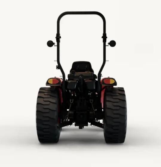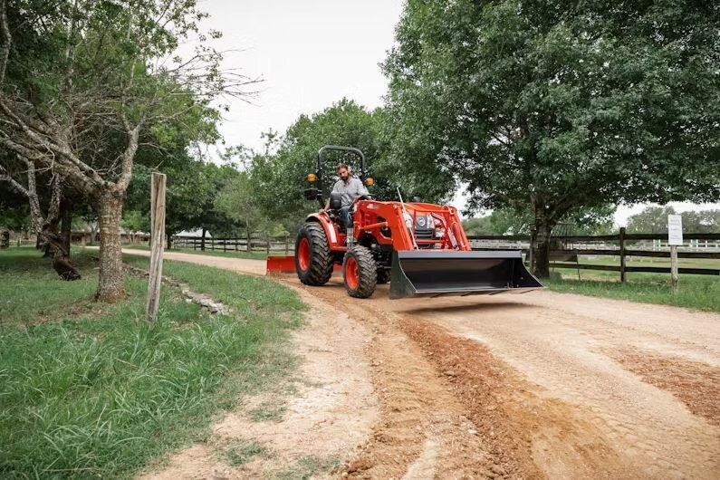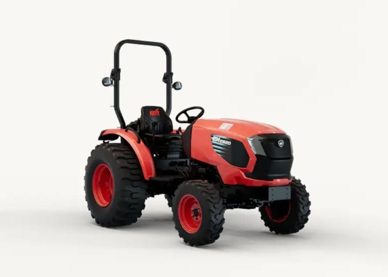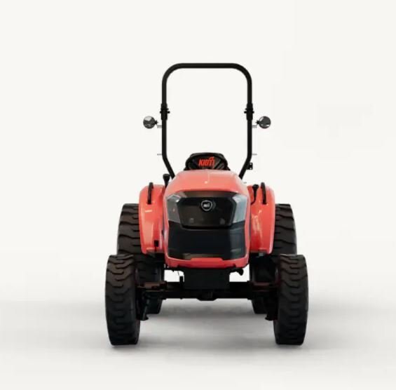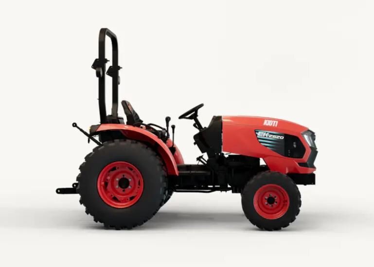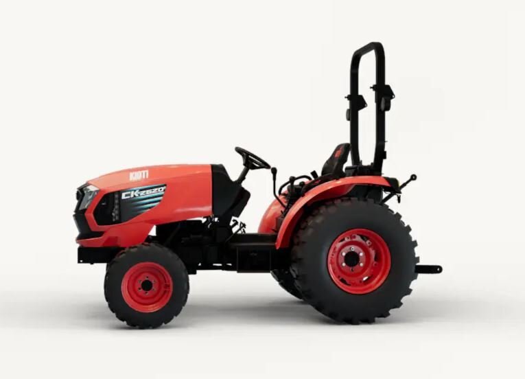 KIOTI's hydrostatic transmission 26 horsepower compact tractor with twin HST pedals for easy and quick forward and reverse, category 1 three-point hitch, and four-wheel drive engaged by a single lever.