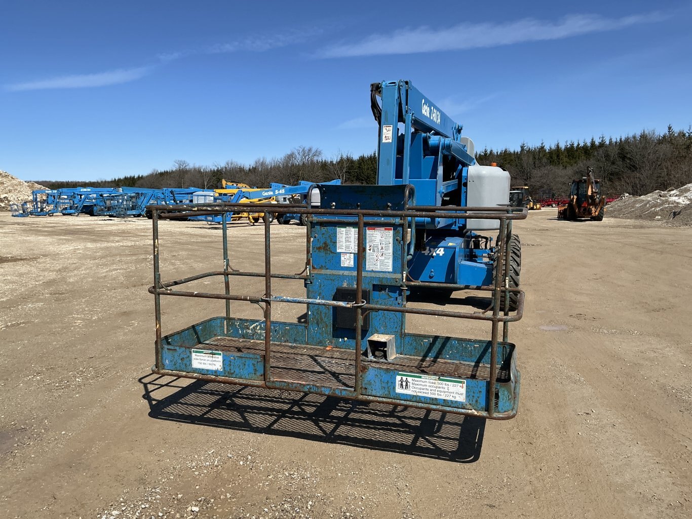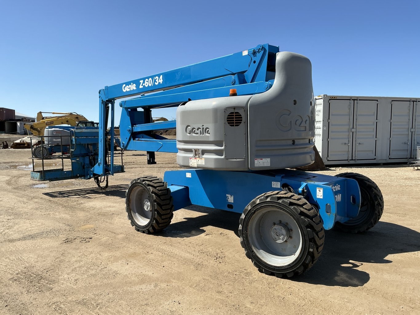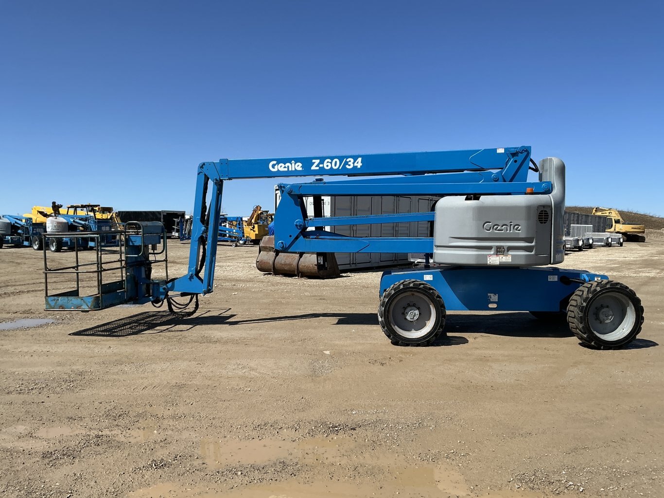 Articulating man lift, 2013 Genie model Z60/34. This boom lift has a platform height of 60 feet giving 66 feet working height and 36 feet outreach. 4WD driveline and powered by a Duetz diesel engine. Machine weighs around 24,000 lbs. Hour meter shows 4186.
