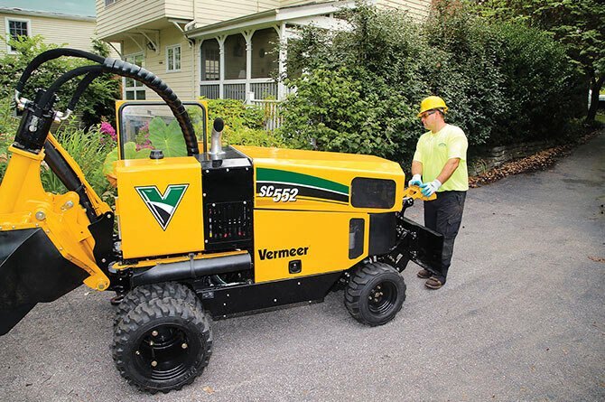 The Vermeer SC552 stump cutter is designed to maneuver through tough jobsite conditions. A unique four-bar linkage allows the cutter wheel to move away from the machine as the boom drops down toward the stump, reducing the need to reposition the entire unit. This machine can achieve cutting heights of 31 in (78.7 cm) above ground and 25 in (63.5 cm) below grade. The four wheel drive and variable speed control gives the SC552 traction in difficult ground conditions and, an optional remote provides propel, boom and steering function control. Chips can be easily moved on the jobsite with the standard 34 in (86.4 cm) wide front-mounted chip blade. |
