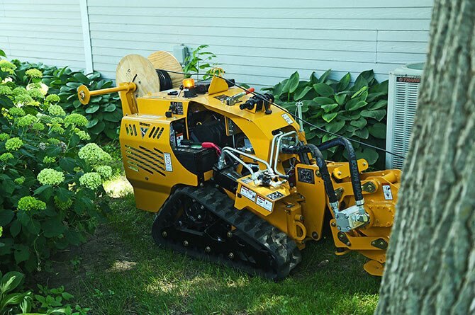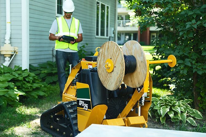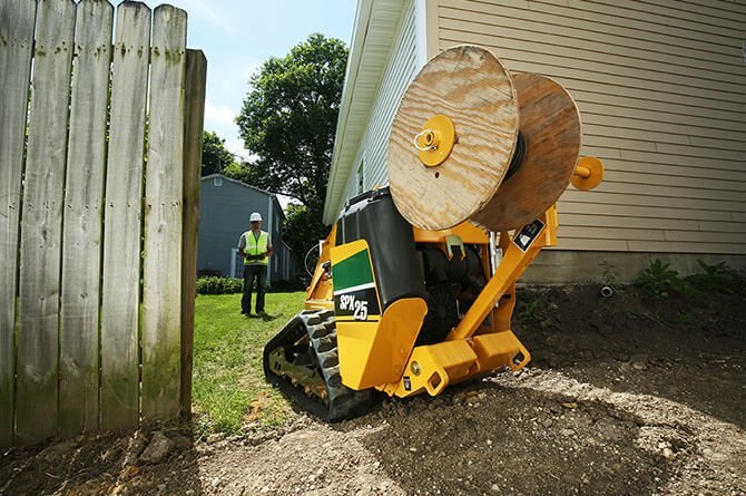 | The SPX25 is operated with a full-function remote control that provides greater maneuverability in congested and tight jobsites. A 25 hp (18.6 kW) Kohler gas engine provides ample power for both plowing small pipes and cables at depths of 12 in (30.5 cm) or less and boring underneath driveways and sidewalks. |