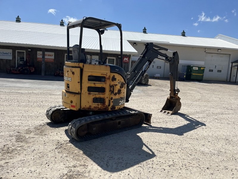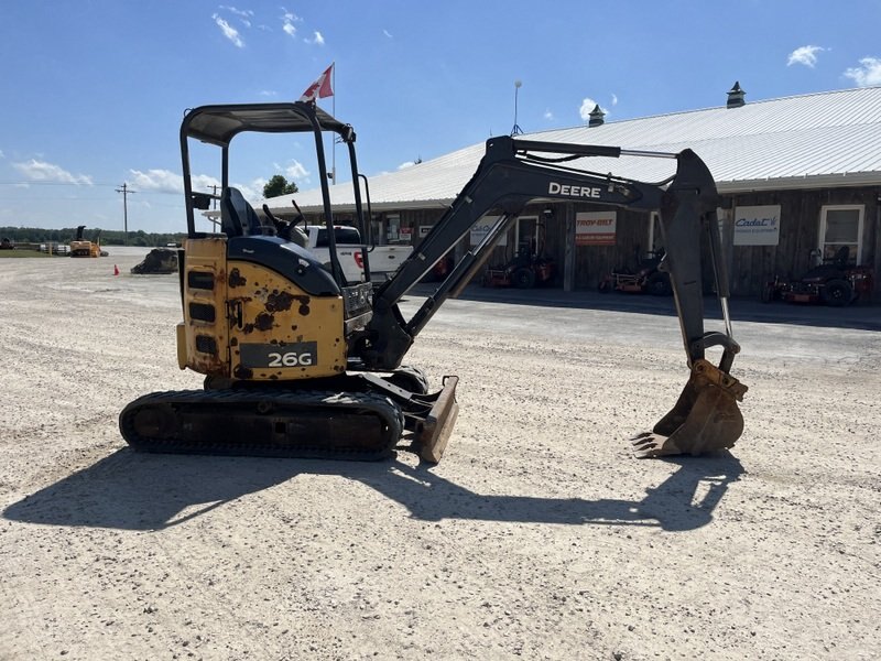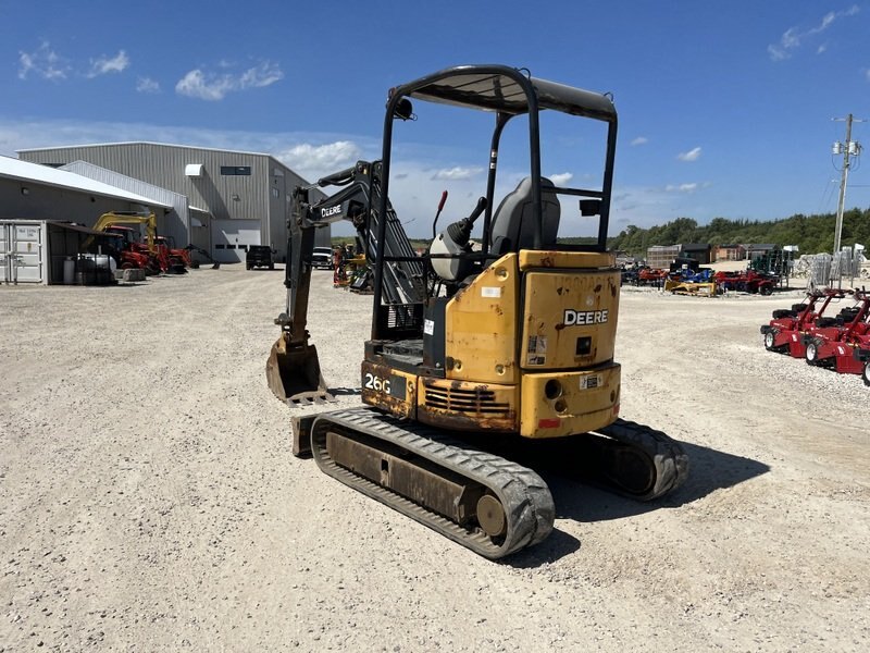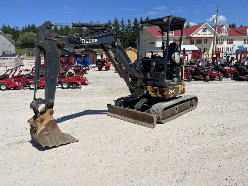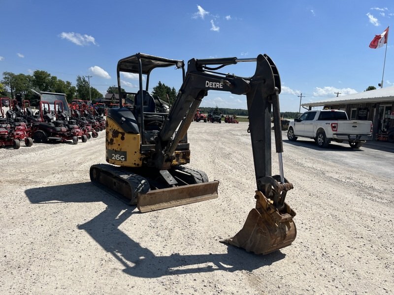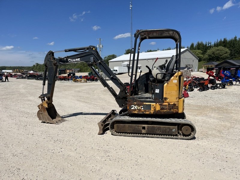 2016 John Deere 26G is powered by a 20hp Yanmar diesel engine. Unit is equipped with a manual wedge coupler and auxiliary hydraulic. Two speed driveline. Unit weights about 6100lbs. Hour meter reads 3253.