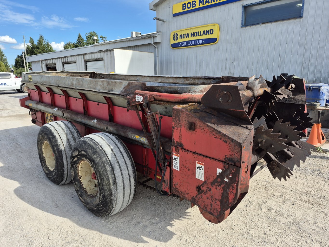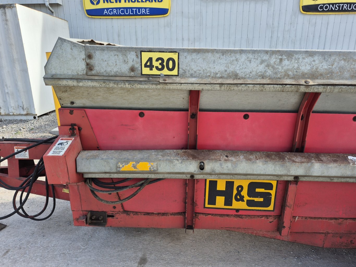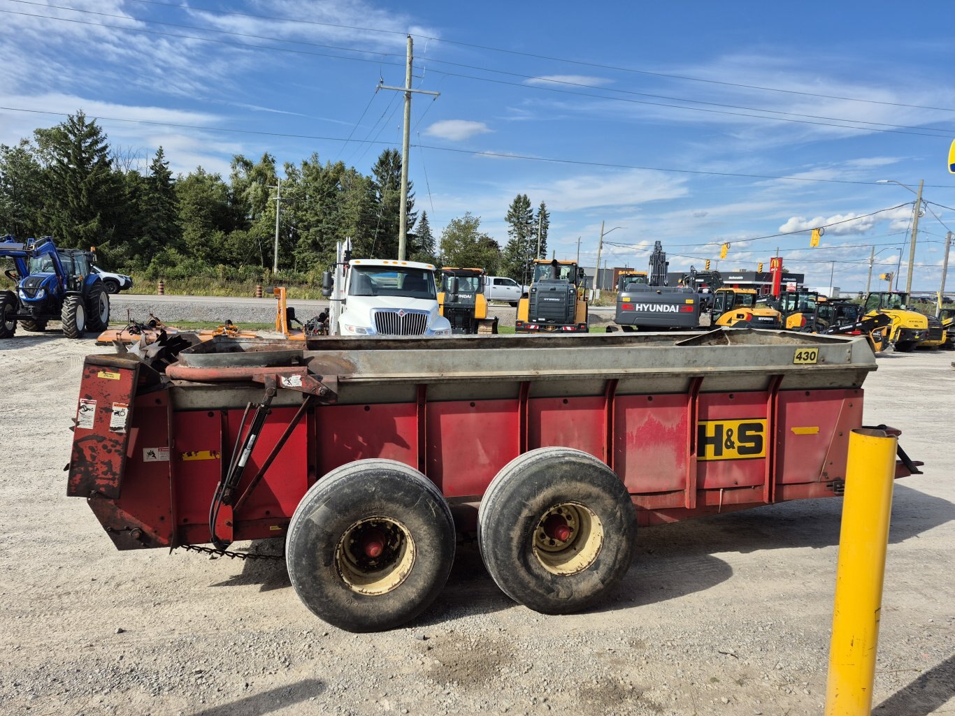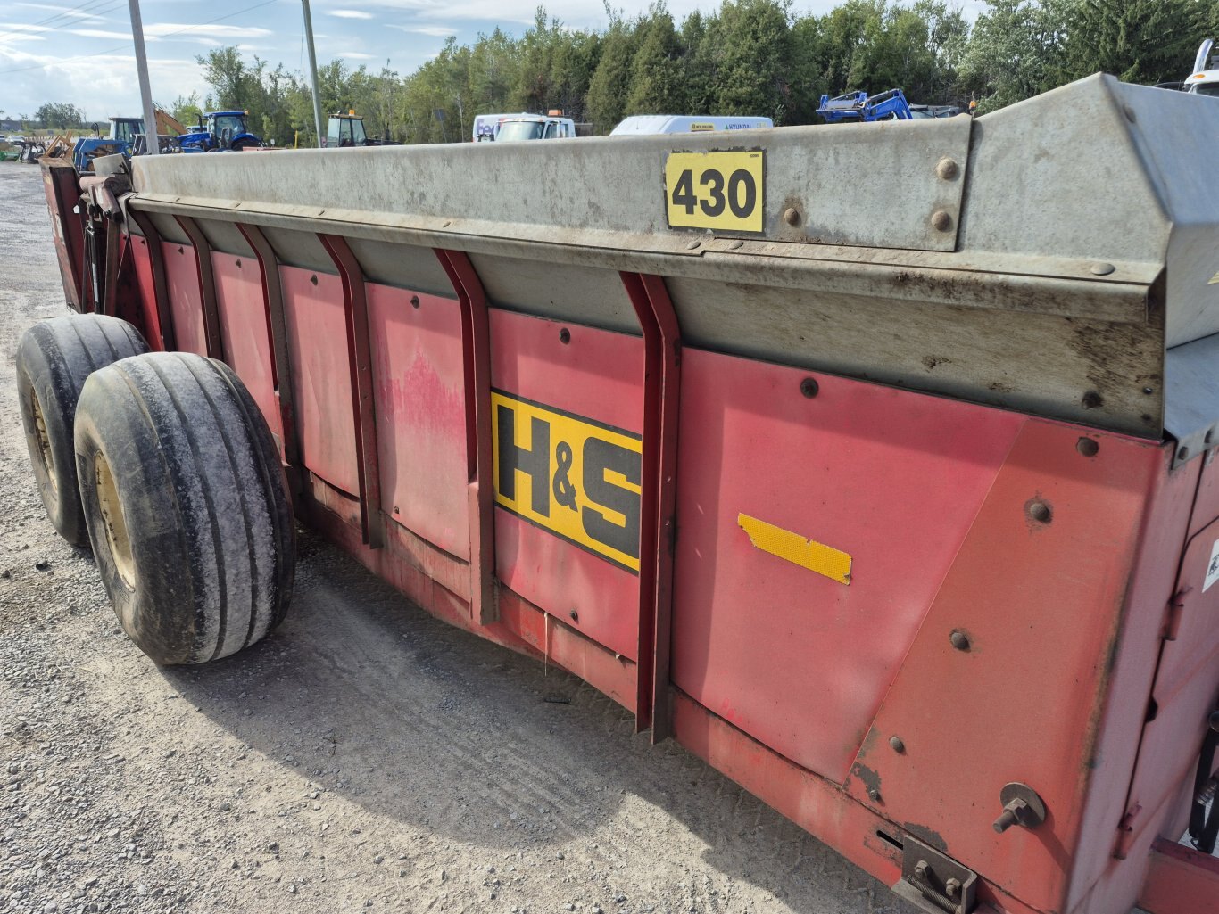 2005 H&S 430 manure spreader, 430 bushel or 386 cubic foot heaped capacity, 540 rpm PTO, Tandem axle with 16.5x16.1 flotation tires, Hydraulic endgate, Upper beater, Front splash guards & side shields, T-Rod apron chain, Hydraulic drive apron, Poly floor & endgate, Sides are poly covered plywood, Always stored inside