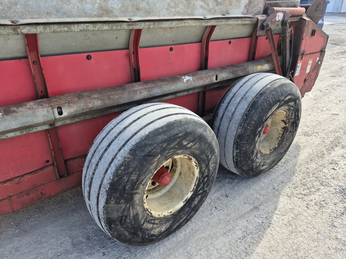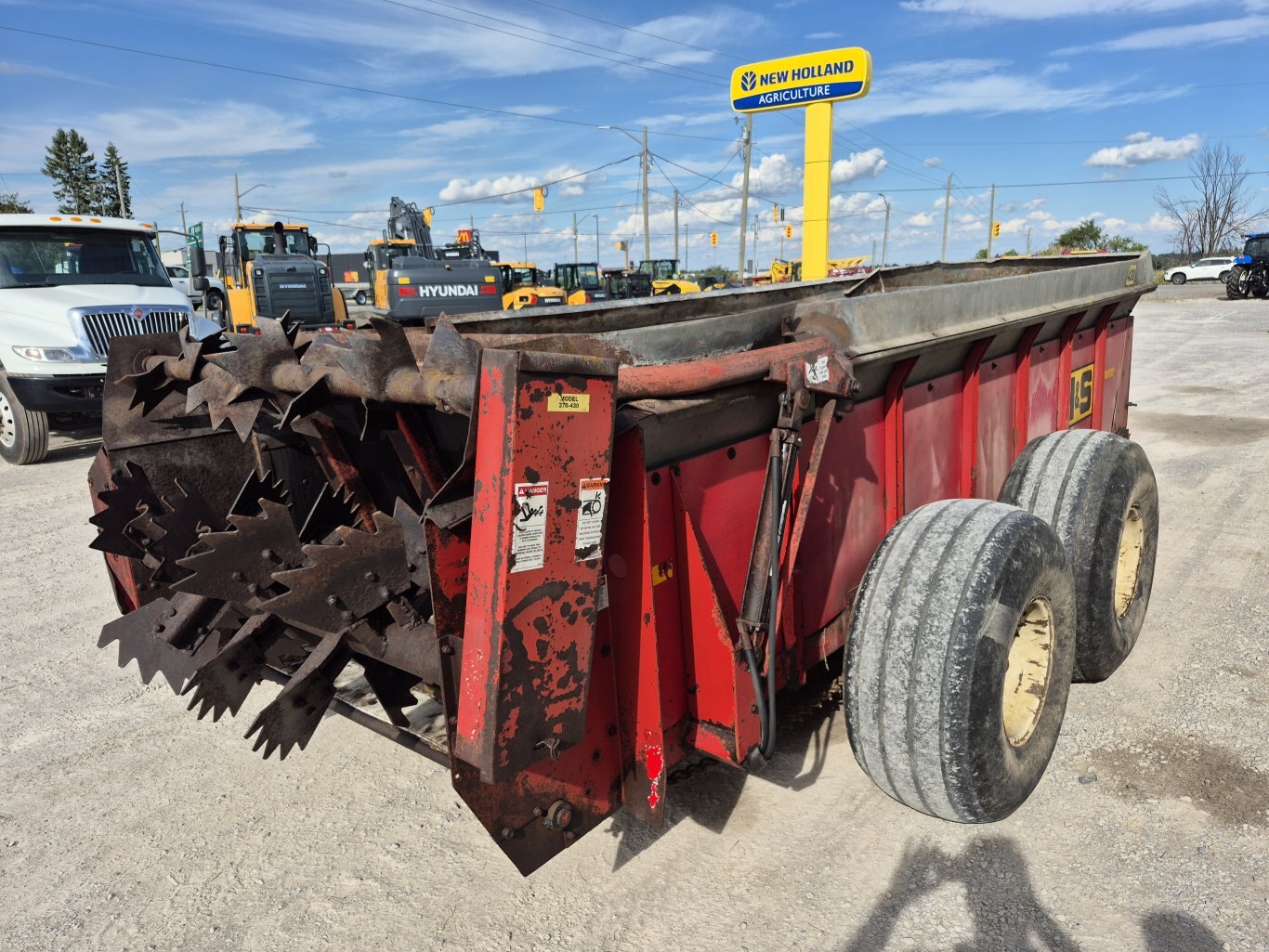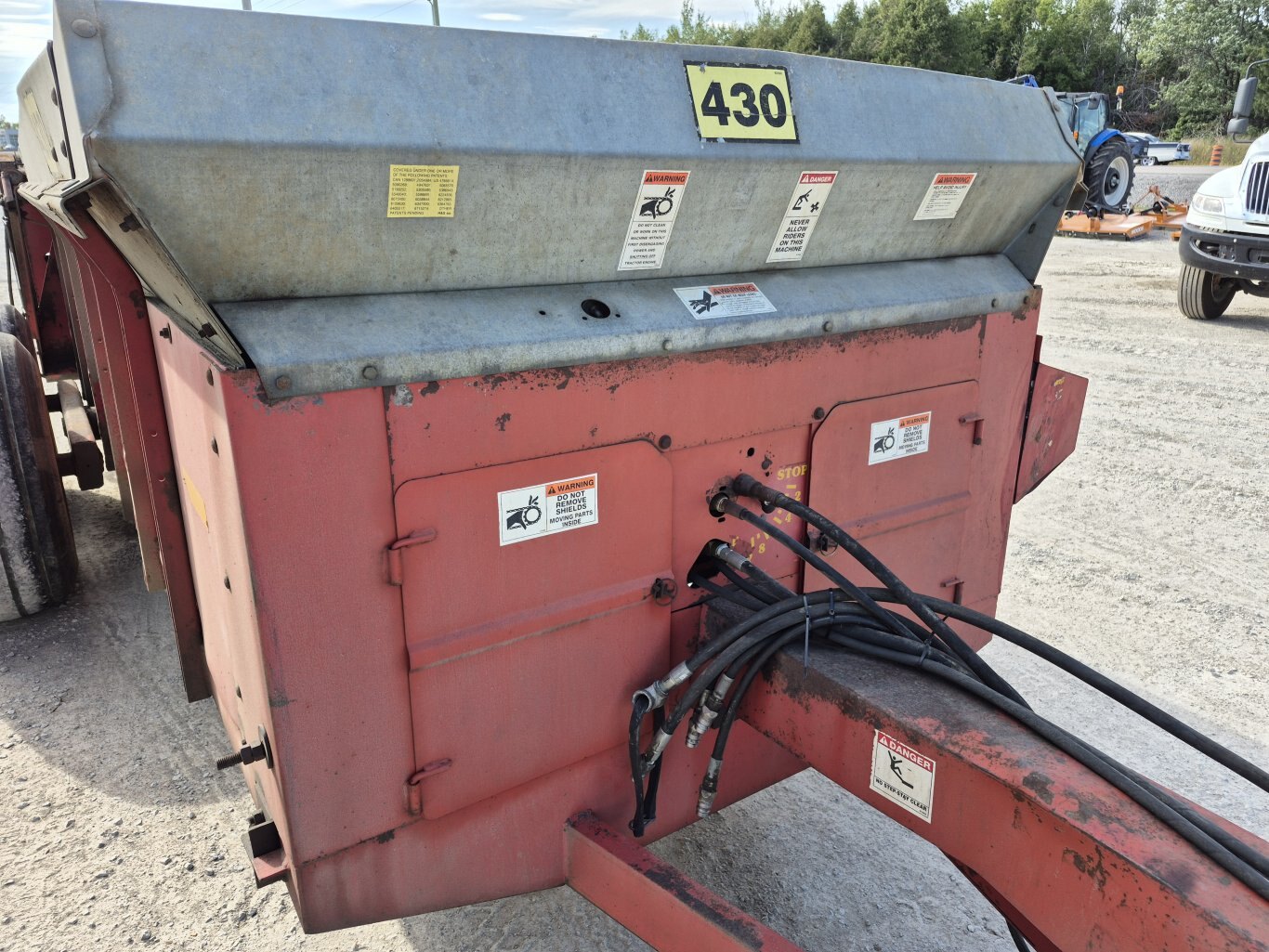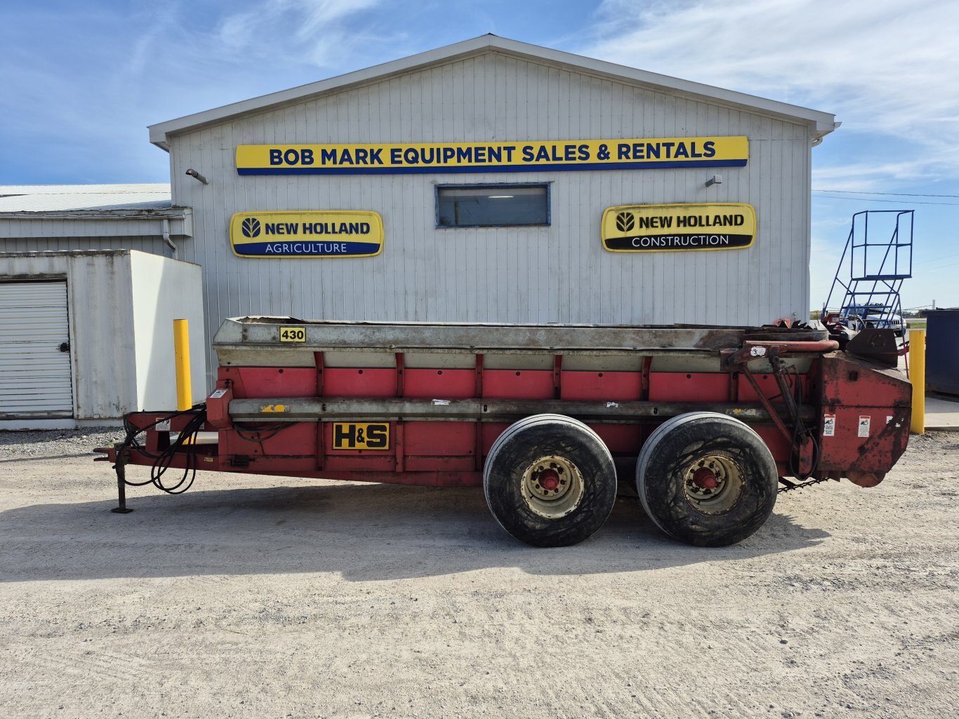 2005 H&S 430 manure spreader, 430 bushel or 386 cubic foot heaped capacity, 540 rpm PTO, Tandem axle with 16.5x16.1 flotation tires, Hydraulic endgate, Upper beater, Front splash guards & side shields, T-Rod apron chain, Hydraulic drive apron, Poly floor & endgate, Sides are poly covered plywood, Always stored inside
