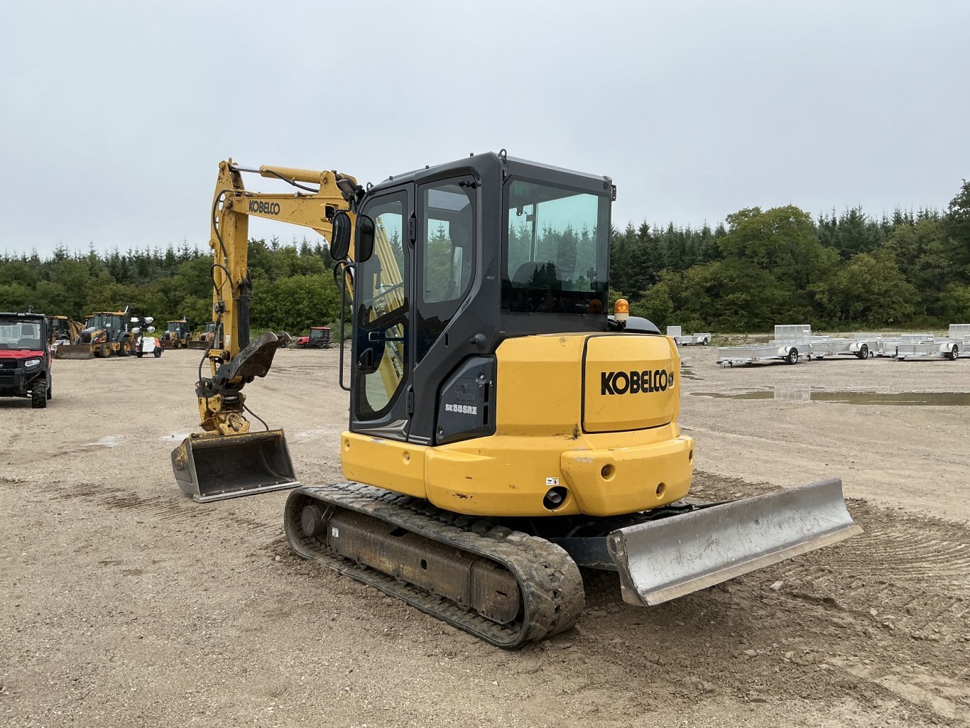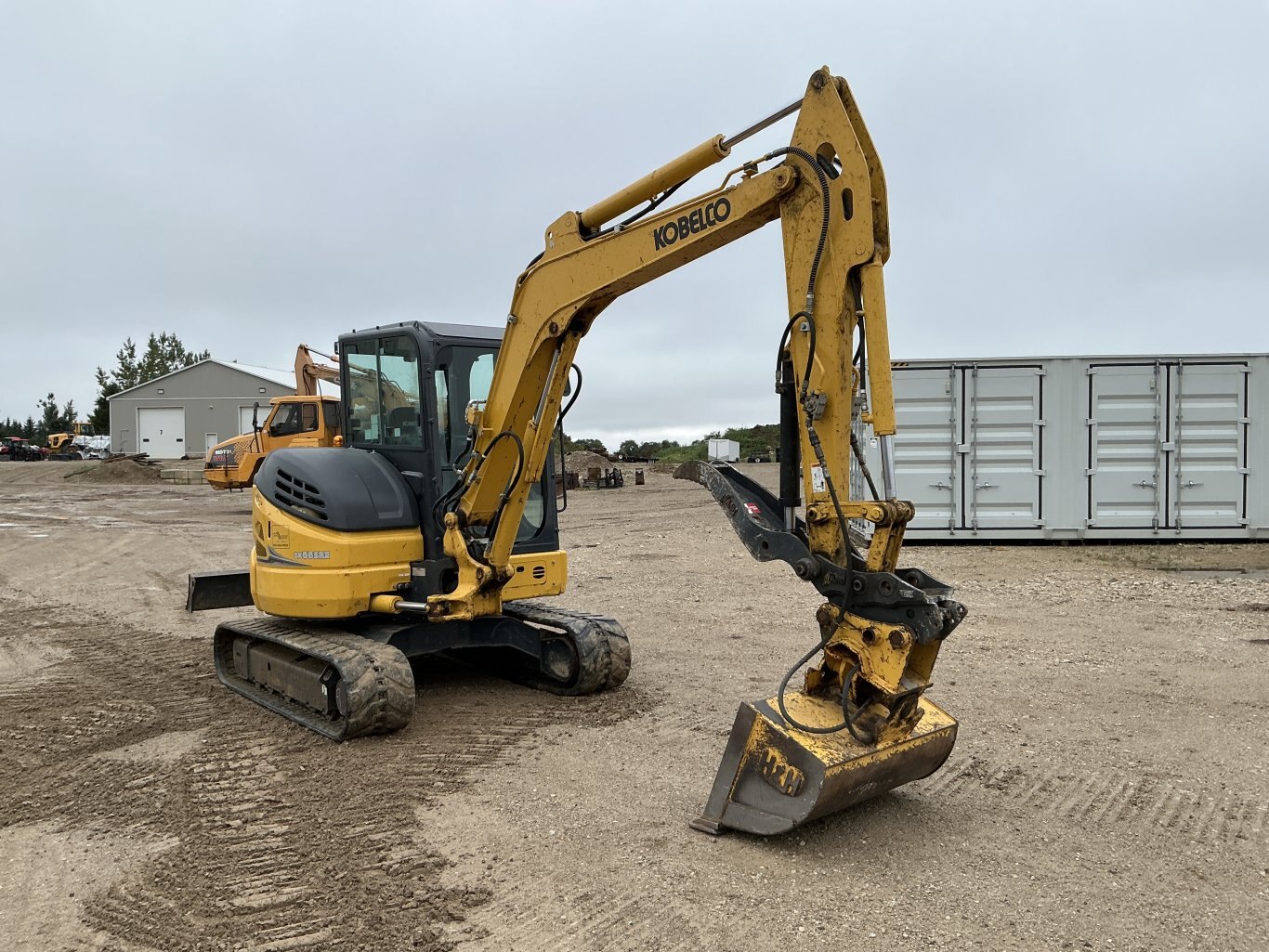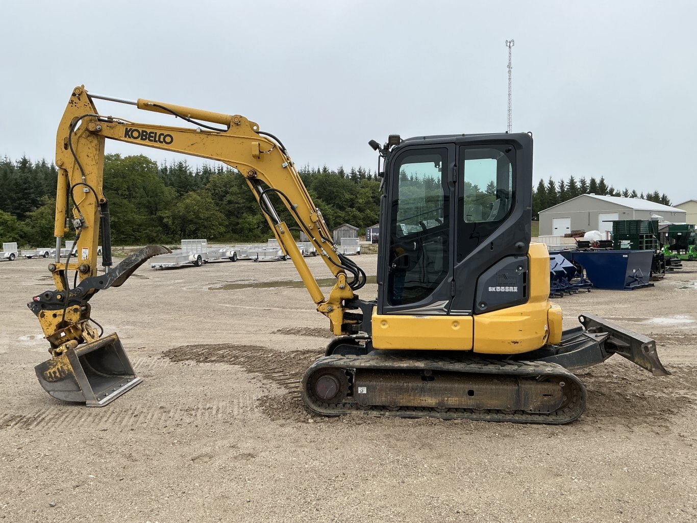2022 KOBELCO SK55SRX MINI EXCAVATOR. 37HP YANMAR DIESEL ENGINE. SHORT RADIUS TAIL SWING. ENCLOSED CAB. MACHINE HOURS 2276.9.