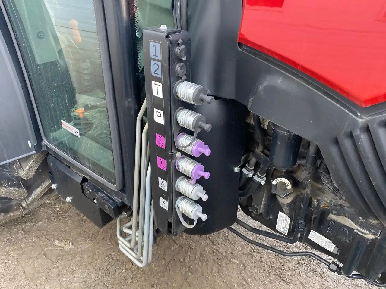 U of G LEASE RETURNS SAVE, New warranty, 180 Hrs, Air seat, Deluxe cab, 40 KPH, Shuttle, Electronis Draft, 32 f/16/R speeds with Two speed power shift, Front three point hitch, with super MEGA Hyd Pump, 3 Remotes with 1 Diverter, 2 Elec. Mid Mount Valves, 540/1000 Rpm, MFD with Dif lock, rear fender extensions, wheel weights, Transmission 32 F 16 R, Front Tire Size 280/70R18, Rear Tire Size 420/70R28, No Duals