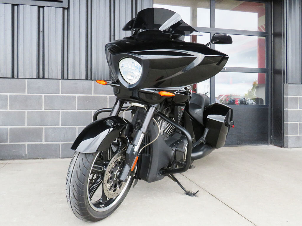 Bagger motorcycle riders ride in style on the Cross Country 8-Ball from Victory Motorcycles. It has a stylish fairing, audio, convenient storage space, comfortable seating for one or two riders, and blacked-out style.