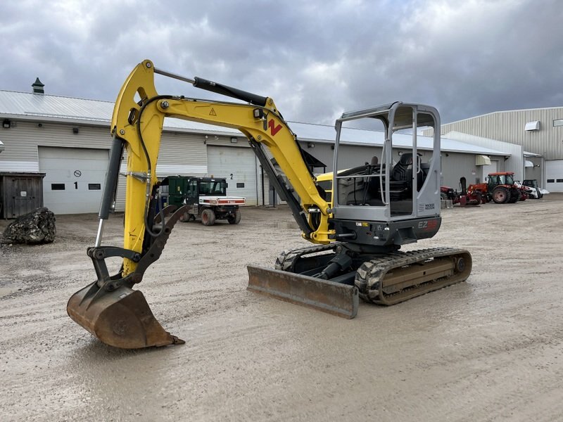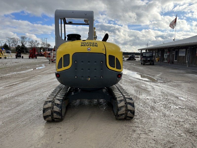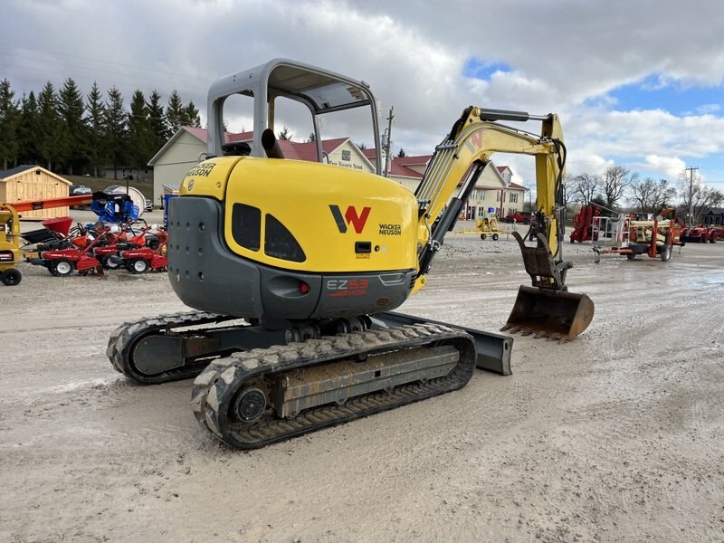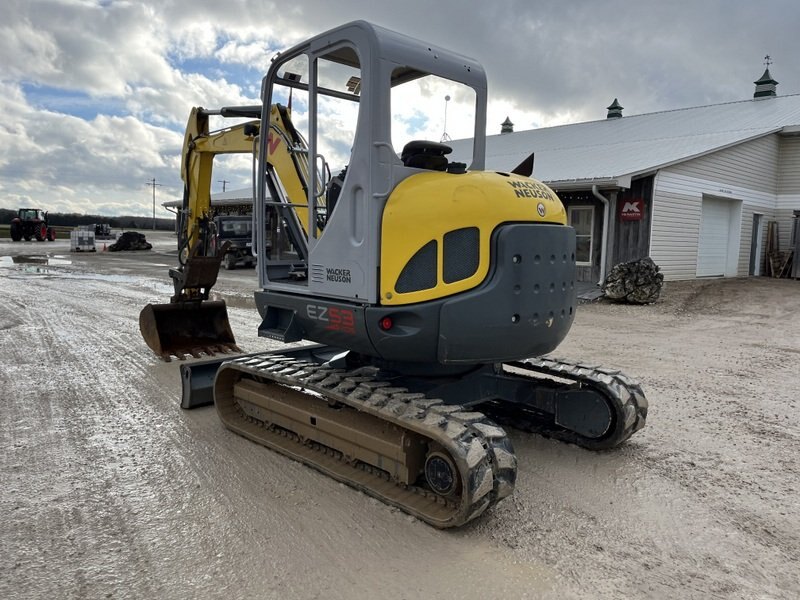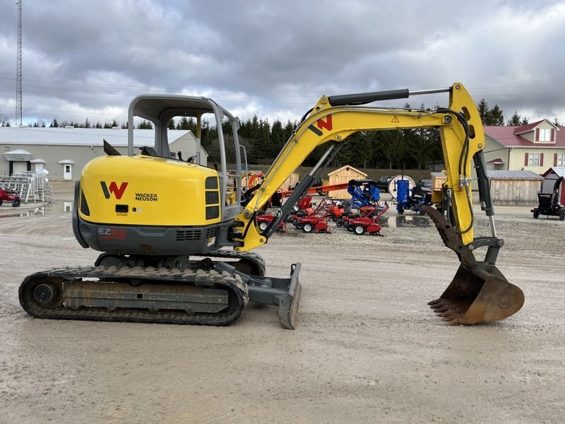 2021 Wacker Neuson EZ53 is powered by a 59hp Perkins diesel engine. Equipped with VDS body tilt up to 15 degrees. Unit is equipped with a hydraulic thumb, hydraulic 2 way dozer blade and auxiliary hydraulic. Two speed driveline. Unit weights about 12000lbs. Hour meter reads 760.